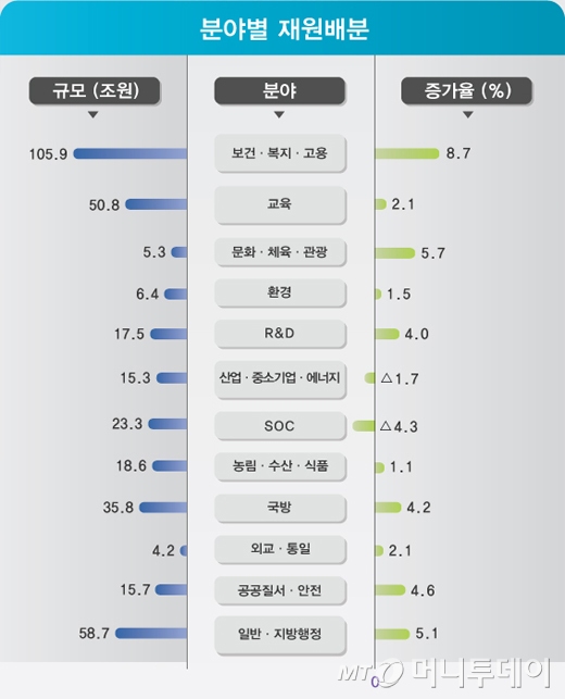 균형점 찾기를 목표로 했지만 실제 무게중심은 경기 회복에 뒀다. 예산안 제목부터 '경제 활력·일자리 예산'이다. 현오석 부총리 겸 기재부장관은 이를 "해야 할 일"이라고 규정하고 "재정의 경기대응 역할과 재정건전성을 동시에 고려하는 전략적 재정운용"이라고 말했다.