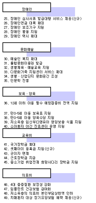 대부분 기존 제도와 복지·시설 확충, 지원금 확대 등이다. 이 가운데 새로 도입하는 것들이 눈에 띈다.