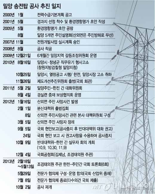5월29일 주민반대대책위원회(반대위), 국회, 정부, 한전이 전문가협의체를 구성하고 협의체 운영기간동안 공사를 멈추기로 합의하면서 중단된 공사가 4개월여 만에 재개되는 것이다. 당시 전문가협의체는 40일간 우회송전과 지중화에 대한 기술적 검토를 통해 우회송전과 지중화가 어렵다는 결론을 내렸다.