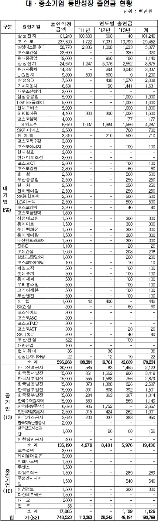 기업별로 보면 82개 동반성장 대상 기업 중 최대 규모인 2376억원의 출연금을 약정한 포스코가 실제 내놓은 돈은 약정액의 12.4%인 295억원이었다.