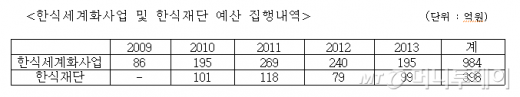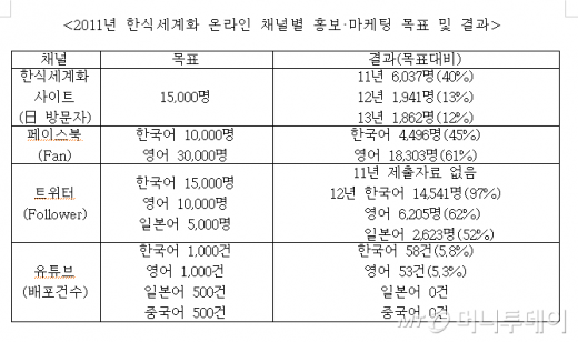 이와 함께 온라인 채널을 통한 홍보기법의 하나로 추진된 한식세계화 사이트 사업도 운영이 엉망이었다. 당초 한식재단은 하루 평균 1만5000명의 방문자를 목표로 했지만 운영 결과, 2011년 6087명, 2012년 1941명, 2013년 1862명에 그쳤다. 또 하루 평균 500건씩 제공키로 했던 일본어, 중국어 컨텐츠는 단 1건도 배포되지 않았다.