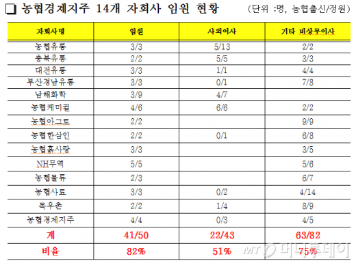 [국감]자회사 임원 50명 중 농협출신이 41명, 사외이사는 절반이상 차지