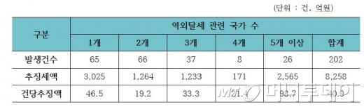 특히, 지난해 적발된 역외탈세 적발 건수 202건 중 특정 1개 국가에서만 발생한 단순역외탈세는 65건 추징액 3025억 원 인 것에 반해, 2개 이상 국가를 거친 복함역외탈세가 137건 5233억 원에 달한 것으로 조사됐다.