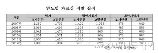 연도별 자료상 적발 실적을 살펴보면 2007년 1702명, 2008년 1492명, 2009년 1474명, 2010년 1571명, 2011년 1410명, 2012년 1384명으로 조사됐다.