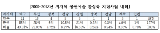 대규모 공연예술 중심의 공연예술 축제 및 기획행사 지원을 통해 지역 문화예술발전과 국민의 문화 향수권을 신장하겠다는 '지자체 공연예술 활성화' 지원 사업이 특정 지역에만 심각하게 편중 지원됐다는 지적이 나왔다.