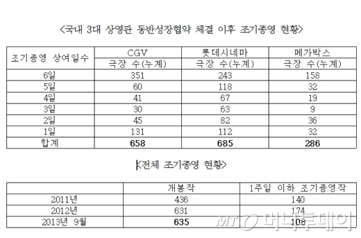 국내 영화상영관의 90% 가까이를 차지하고 있는 이들 3대 상영관이 개봉작들을 조기종영 하는 결과로 올해 9월말까지 개봉작 635편 중 108편이 1주일을 채우지 못하고 조기종영 됐다. 또 2011년부터 2013년 9월말까지 일주일 이하 상영하고 종영한 상영관은 누계기준으로 모두 2591개소이며, 이중 6일을 상영한 상영관은 1062개에 달했다.