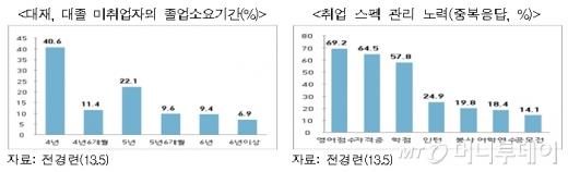고용노동부에 따르면 지난 2002년 청년들이 꼽았던 '취업 5대스펙(학벌, 학점, 토익, 어학연수, 자격증)'은 2012년 조사결과 봉사, 인턴, 수상경력이 추가돼 '8대스펙'으로 늘어났다. 취업 준비를 위해 휴학을 하거나 대학원에 진학하면서 노동시장 진입은 점점 더 늦춰지는 추세다.