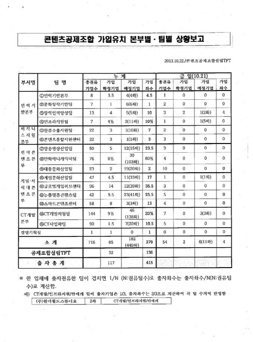 특히 박 의원이 공개한 '콘텐츠공제조합 가입유치 본부별 팀별 상황보고' 문서에 따르면 콘텐츠진흥원은 이달 들어 '발등에 불'이 떨어진 상황이 되자, 게임·차세대콘텐츠본부 등 5개 본부와 15개 팀별로 과거 자신들의 지원을 받았던 각종 협회와 중소기업을 상대로 출자 독려 활동에 나섰다.