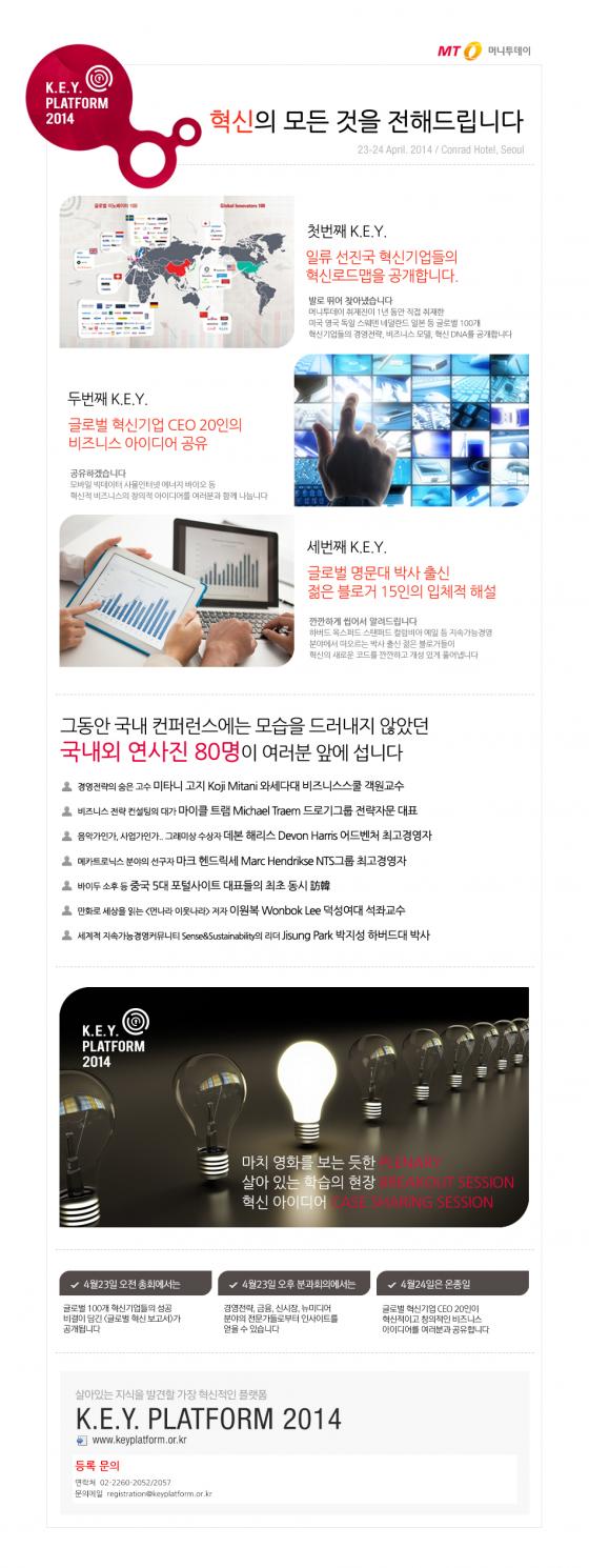 급변하는 비즈니스 환경 속에서 새롭고 창조적인 아이디어와 혁신의 전략이 필요한 여러분들을 머니투데이 글로벌 콘퍼런스 '2014 키플랫폼'(K.E.Y. PLATFORM 2014)에 초대합니다.