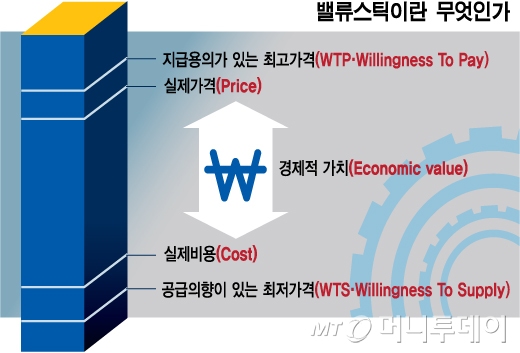 수직선 하나와 △가격 △비용 △'지불 용의 최고가격'(WTP·Willingness to pay) △'납품 용의 최저가격'(WTS·Willingness to supply) 등 4개의 수평선 만으로 이뤄진 '밸류스틱'은 기업이 가치를 창출하는 과정을 지극한 단순한 그림 하나로 설명하고 분석할 수 있다는 것이 가장 큰 장점입니다.