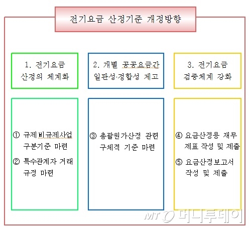 이로써 전기요금 원가는 발전과 송·배전 등 규제서비스 제공과 관련한 영업비용(매출원가, 판매비, 관리비)과 법인세비용을 합한 금액에 영업외손익(유·무형자산처분손익, 재고자상처분손익, 재해손실 등)을 가감한 금액으로만 정해진다. 이렇게 되면 전기요금 산정 과정이 보다 투명해져, 요금 인상에 대한 요인이 보다 명확해진다.