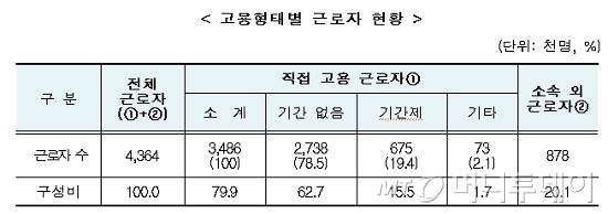이번 공시엔 공시대상 사업주 2947곳 중 2942곳이 공시에 참여(공시율 99.8%)했다. 전체 사용근로자의 고용형태를 살펴보면, 사용근로자 436만4000명 중 직접고용 근로자가 79.9%(348만6000명), 소속 외 근로자는 20.1%(87만8000명)로 나타났다. 직접고용 근로자는 근로계약 기간의 정함이 없는 근로자 78.5%(273만8000명), 기간제 19.4%(67만5000명), 기타 근로자 2.1%(7만3000명)으로 각각 조사됐다.