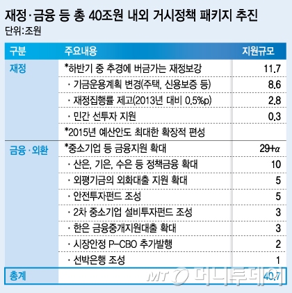 진단(소극적)에 따른 처방은 ‘과감한’ 대응이다. 최 부총리는 당초 추가경정예산편성을 고민했다. 하지만 시기와 시차 등이 발목을 잡았다. 대신 ‘추경에 버금가는’재정·금융의 ‘총동원’ 정책을 내놨다. 재정 투입만 11조7000억원으로 지난해 세출 추경 규모(5조3000억원)의 2배에 달한다. 기금(6조6000억원), 재정집행률(2조8000억원), 민간 선투자(3000억원) 등 모두 긁어모았다.