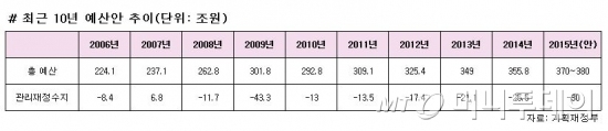 이는 올 상반기 정부 각 부처가 제출한 내년 예산·기금의 총지출 규모(377조원)와 비슷한 수준이지만 지난해 총지출 증가율(4.0%)이나 정부가 2013~2017년 중기재정운용계획에서 제시한 연평균 재정지출 증가율(3.5%)을 크게 넘어서는 수준이다.
