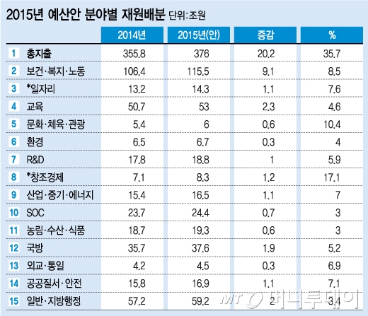 18일 기획재정부가 발표한 ‘2015년 예산안’과 ‘2014~2018년 국가재정운용계획’에 따르면 지난해 작성한 ‘2013~2017년 중기재정운용계획’에서 밝혔던 전망치가 전면 수정됐다. 저성장과 장기 불황 위험에서 탈출하기 위해 확대 재정 정책을 추진하면서다. 내년 예산의 확장 편성이 중기 재정에도 영향을 줬다. 총지출 증가율은 연평균 4.5%, 총수입 증가율은 5.1%로 잡았다.