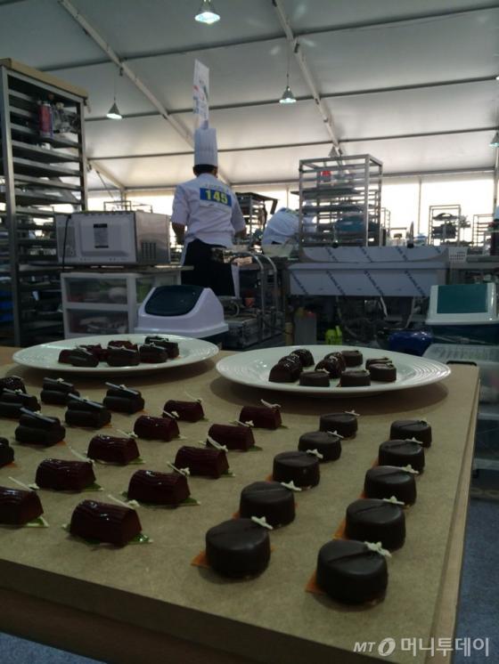 부천 현장서 단연 인기가 높은 경기장은 B동 제과·제빵 경기장이었다. 전날 대리석 조각작품에 버금가는 조형미를 자랑하는 설탕공예 작품을 만들어냈던 참가자들은 이날 과제에 따라 초콜릿 디저트를 만드느라 잰 손을 놀렸다. 달콤한 초콜릿 향기에 끌린 관람객들이 대회장 주변에 북적였다. 선선한 가을날씨였지만 초콜릿을 녹이는 열과 대회 현장의 열기에 참가자들의 이마엔 땀방울이 송글송글 맺혔다.