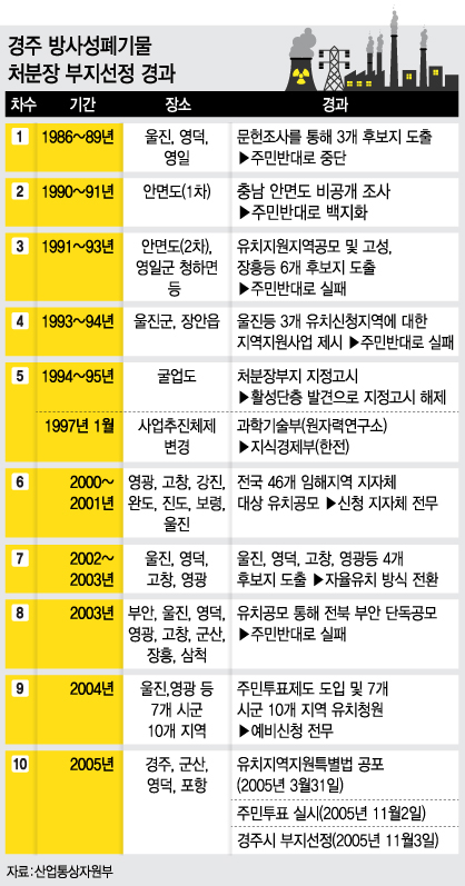 경주 방폐장은 이르면 내년 3월께 가동에 들어갈 예정이다. 원자력안전위원회는 지난 11일 경주 방폐장의 운영허가·승인안을 의결했다. 사업 착수 시점을 기준으로 무려 29년만이다. 정부는 1986년부터 울진, 영덕, 안면도, 굴업도 등에 방폐장을 지으려 시도했지만 주민 반대로 번번이 무산되다가 2005년 11월에야 부지 선정에 성공했다.