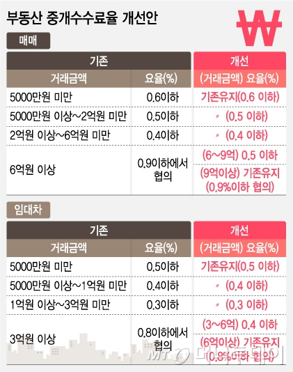 국토부의 중개수수료 개선안은 매매가격 6억~9억원 주택의 경우 중개 수수료 요율을 현행 '0.9% 이하 협의'에서 '0.5% 이하'로 낮추고, 임대차 3억~6억원의 경우 '0.8% 이하 협의'에서 '0.4% 이하'로 낮추는 게 핵심이다. 매매가 6억원·전세금 3억원 이상의 고가주택이 늘어난 현실에 맞춰 수수료 체계를 개편해 서민 부담을 덜어주자는 취지다.