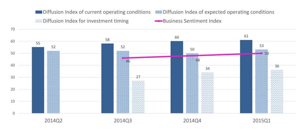 아울러 공급과잉에 대한 기업의 우려를 반영한 지수는 지난해 2분기와 3분기 각각 71과 73으로 70선을 상회했으나 지난해 4분기와 올해 1분기는 각각 67과 69로 70선을 밑돌며 개선세를 나타냈다. 공급과잉에 대한 만연했던 우려가 다소 완화된 것으로 풀이된다.