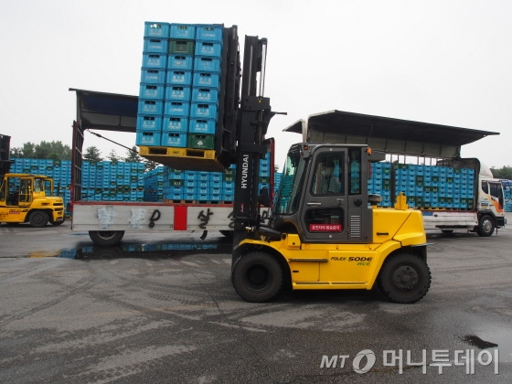 3일 찾은 경기도 이천시 무촌리에 있는 하이트진로 이천제조창. 이른 아침부터 야적장으로 대형 화물트럭이 줄지어 들어왔다. 트럭마다 물류센터에서 거둬들인 빈 병이 가득했다. 트럭 화물칸이 열리기 무섭게 지게차들이 연신 시끄러운 경고음을 울리며 빈 병을 실어 날랐다.