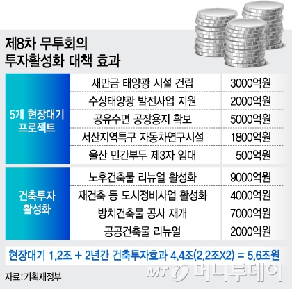 정부가 30년 이상된 노후 건물들끼리 용적률을 서로 사고 팔수 있는 '결합건축제도'를 도입, 9000억원의 투자를 끌어낸다. 새만금에 태양광시설 건립을 허가해주는 등 5개의 현장대기 프로젝트를 통해선 1조2000억원의 투자 환경을 조성한다. 민간 자금이 벤처 생태계에 들어올 수 있도록 각종 세제혜택을 주고, 전국 산악지역의 70%에 휴양지를 조성하는 등 총 5조6000억원의 투자를 창출할 방침이다. 또 25조원의 정책자금을 투입, 수출 활성화에 나선다. 수출 경쟁력 강화를 위해 민간 부문에서 91조원의 투자를 끌어내, 올해도 무역 1조달러 이상을 달성할 계획이다.