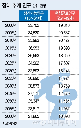 ◇인구부족 문제 얼마나 심각하길래...=22일 기획재정부 등에 따르면 우리나라는 오는 2017년부터 생산가능인구(15~64세)가 줄어든다. 2016년(3704만명)을 정점으로 감소하기 시작해 2050년엔 2535만명으로 1000만명 이상 줄어든다. 전체 인구 중 일을 할 수 있는 사람이 갈수록 사라져, 결국 노동력 부족 국가가 된다는 의미다.