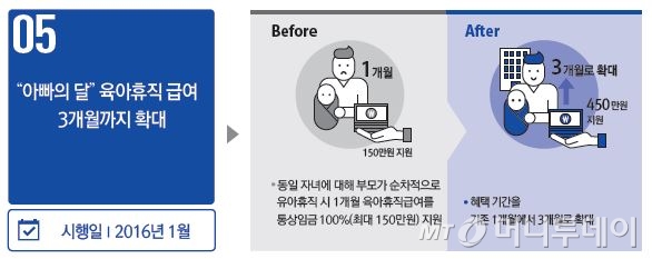 '아빠의 달'은 한 자녀의 육아를 위해 엄마에 이어 아빠가 육아휴직 할 경우, 휴직급여를 지급하는 제도다. 기존에는 최대 150만원까지 지급했으나, 3개월까지 최대 450만원을 지원하게 된다.