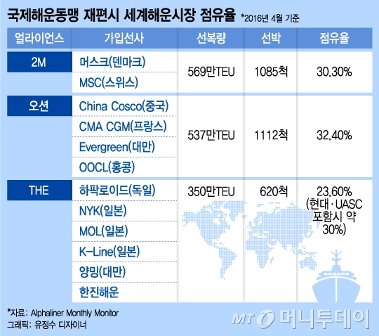 독일의 하팍로이드, 일본의 NYK, MOL, K-LINE(케이라인), 대만의 양밍, 한진해운이 포함됐다.