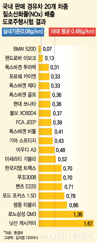 이 외에 나머지 차량의 질소산화물 배출량은 △BMW 520D 0.07g/㎞ △랜드로버 이보크 0.13g/㎞ △폭스바겐 투아렉 0.31g/㎞ △포르쉐 카이엔 0.33g/㎞ △폭스바겐 제타 0.33g/㎞ △폭스바겐 골프 0.36g/㎞ △현대 쏘나타 0.36g/㎞ △볼보 XC60D4 0.37g/㎞ △FCA JEEP 그랜드체로키 0.39g/㎞ △폭스바겐 비틀 0.41g/㎞ △기아 스포티지 0.43g/㎞ △아우디 A3 0.48g/㎞ △마세라티 기블리 0.52g/㎞ △한국지엠 트랙스 0.70g/㎞ △푸조3008 0.70g/㎞ △벤츠 E220 0.71g/㎞ △포드 포커스 1.5D 0.78g/㎞ △쌍용 티볼리 0.86g/㎞ 등으로 나타났다.