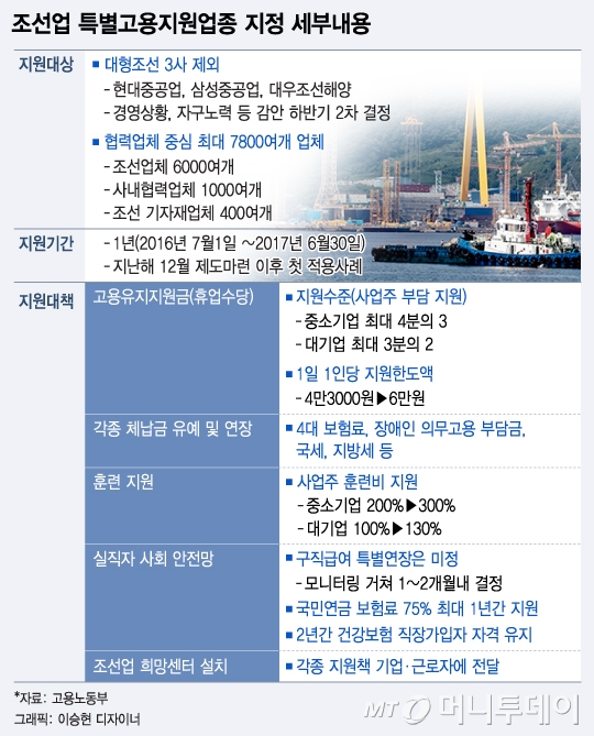 정부는 특별고용지원업종을 통해 대량 실직사태에 대비해 피해를 최소화한다는 구상이다. 이번 특별고용지원업종의 대상이 되는 기업은 협력업체를 중심으로 최대 7800여개 업체에 달한다. 조선업체 6500여개 외에도 1000여개의 사내협력업체와 400여 기자재업체를 포함한 규모다.