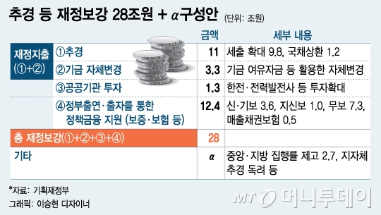 정부는 추경에다 △3조 3000억원 규모 각종 기금계획 변경 △ 한전 및 자회사 등의 에너지 투자 1조 3000억원 △신보·기보·무보 등 정책금융 12조 4000억원을 포함해 총 28조원 이상의 재정보강에 나선다. 이로써 당초 2.5%정도로 예상된 올해 경제성장률을 2.8%로 0.3%포인트 끌어올린다는 방침이다.