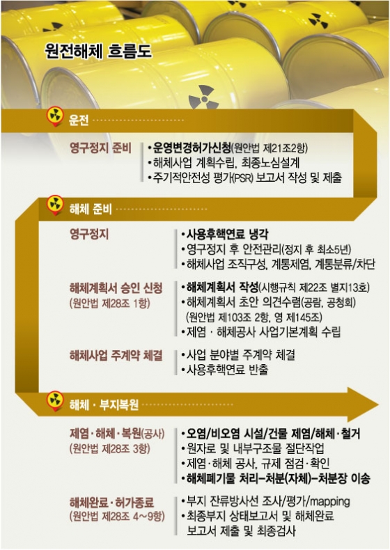 원안위는 해체계획의 안전성, 환경영향 등을 심의해 한수원에 원전해체 작업의 인허가를 내준다. 인허가가 떨어지면 실질적 의미의 원전해체인 ‘제염·해체’ 작업이 시작된다.