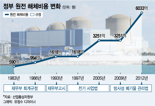 문제는 정부가 원전해체비용이 너무 적게 잡은 것 아니냐는 점이다. 상용 원전해체 경험이 있는 미국과 일본이 쓴 1기당 평균 해체비용은 각각 7800억원, 9590억원이다. 국제에너지기구(IEA)도 2001년 고리 1호기의 단위용량당(㎿) 해체 비용을 약 101만달러(1999년 기준)로 추산했다.