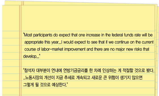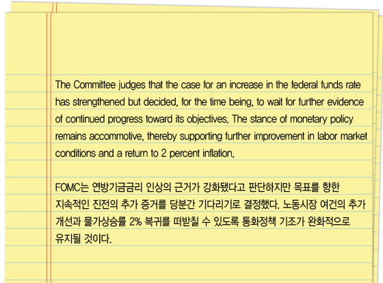 Fed가 이번에 기준금리를 동결한 건 경제여건이 좋아지고 있긴 하지만 금리인상을 정당화할 증거가 좀 더 필요하다고 판단했기 때문이다. 다음은 Fed가 이번에 발표한성명의 일부다.
