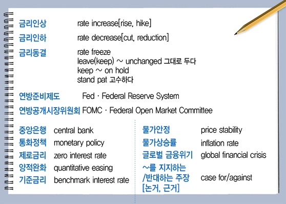 기준금리는benchmark interest rate라고 한다. 간단히rate라고 쓴다.금리인상은rate increase[rise,hike],금리인하는rate decrease[cut,reduction]라고 많이 쓴다. 금리를 동결한 경우 '얼(리)다'라는 뜻의freeze를 쓰면 된다.
