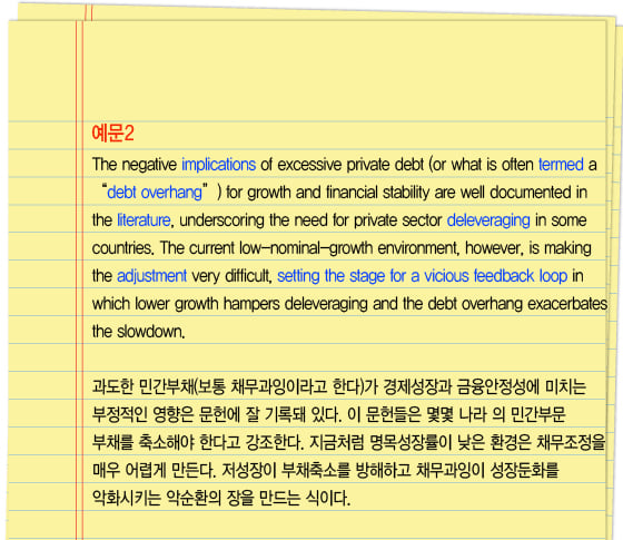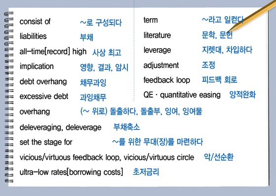 implication은영향,결과,암시라는 뜻이다.overhang은 동사로 (~ 위로)돌출하다, 명사로는돌출부,잉여, 잉여물이라는 뜻이다. 불쑥 튀어나온 걸 의미한다.debt overhang은채무과잉이 된다. 앞에서 쓴excessive debt(과잉채무)와 같은 말이다.term은~라고 일컫다라는 뜻의 동사로 썼다.literature는문학말고문헌이라는 뜻으로도 쓴다.deleveraging,deleverage는 부채를 줄이는 걸 말한다.지렛대를 의미하는leverage는 빌린 돈을 지렛대 삼아 더 큰 수익을 추구하는 걸 의미한다.adjustment는 조정이라는 의미로 여기선 앞에 나온deleveraging을 대신하는 의미로 썼다.set the stage for는~를 위한 무대(장)를 마련하다라는 뜻이다.feedback loop는피드백 회로라는 의미다.vicious feedback loop는악순환이 된다.vicious circle과 같다.vicious대신virtuous를 쓰면선순환이 된다.