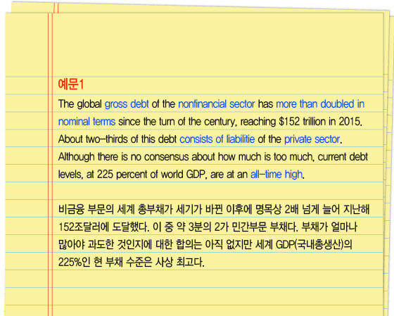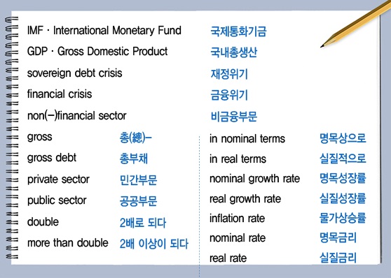 IMF는 보고서에서예문1처럼 글로벌 부채 현황을 설명했다.gross는 GDP에서 보듯총(總)이라는 뜻이다.gross debt하면총부채가 된다.non(-)financial sector는비금융부문으로 은행 등 금융업종을 제외한 기업과 가계를 의미한다. 뒤에서private sector(민간부문)로 받았다. 정부와 공공기관을 아우를 땐public sector(공공부문)라고 한다.double은2배로 되다라는 의미의 동사로 썼다. 앞에more than이 붙어2배 이상이 되다가 됐다.