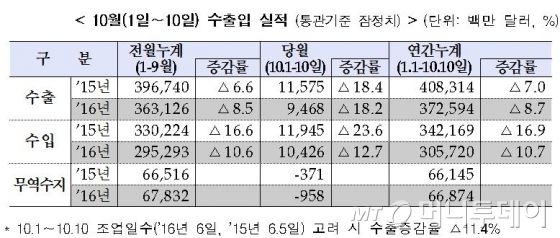 앞서 9월 수출은 현대자동차의 파업에 따른 생산 차질과 삼성전자 갤럭시노트7 리콜사태의 여파로 전년동기대비 -5.9%였는데, 그 여파가 지속되는 것이다.