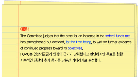 Fed는 지난달 20-21일에 열린 FOMC 정례회의에서 기준금리를 동결했다. Fed는 당시 낸성명에서예문1과 같이 경제여건이 좋아지고 있긴 하지만 금리인상을 정당화할 증거가 좀 더 필요하다고 판단했다.