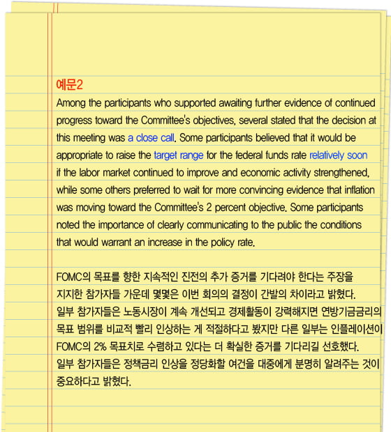 예문2는 Fed가 지난 13일에 공개한 9월 FOMC의사록의 일부다. 지난달 회의에서는 찬성 7명, 반대 3명으로 금리동결 결정이 나왔다. 현재 Fed 이사 2명이 공석이라 의결권을 행사한 이가 10명뿐이었다. 의사록은 지난번 회의에서 금리동결 주장을 한 이들 가운데 아슬아슬하게 동결 주장에 합류한 이들이 적지 않았음을 보여준다.a close call은아슬아슬한 상황을 뜻한다.by a close call은간신히,간발의 차이로라는 뜻이 된다.too close to call은승패를 가리기 힘든이라는 의미다.