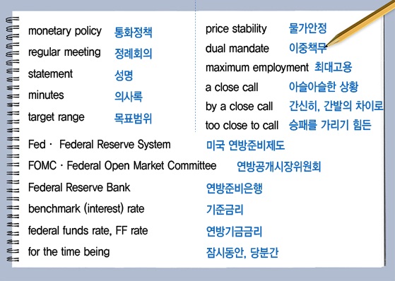 국제 금융시장은 FOMC 성명과 Fed 의장의 회견에 촉각을 곤두세우기 일쑤다. 글로벌 금융위기가 발생한 이후 Fed 움직임에 더 민감해졌다. 최근에 가장 큰 화두는 Fed가 언제기준금리(benchmark interest rate) 인상에 나서느냐다.