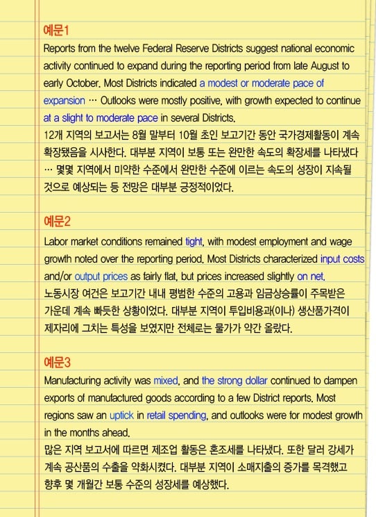 예문1-3은Fed가 19일(현지시간)에 낸베이지북의 도입부 일부다. 전문가들은 Fed의 경기진단이 대체적으로 긍정적이라고 평가했다. 이같은 분석은 Fed가 연내에 금리인상을 단행할 것이라는 전망에 힘을 실어줬다. 올해 남은 FOMC 정례회의는 11월1-2일, 12월13-14일 두 차례뿐이다. 이날 현재연방기금금리(미국 기준금리)선물(federal funds rate futures) 시장에서는 Fed가 11월 FOMC에서 금리를 올릴 가능성을 17%로 봤다. 12월에 금리인상을 단행할 확률은 60%로 관측됐다.