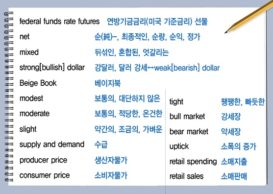 예문1에서 주목할 것은modest(보통의, 대단하지 않은)와moderate(보통의, 적당한, 온건한)라는 표현이다. Fed가 경기진단에 자주 쓰는 단어다. 둘은 뜻이 비슷해 보이지만 경기에 대한 평가 수준으로moderate이modest보다 한 단계 높다고 보면 된다. Fed가 2013년 7월 말 경기진단에서moderate대신modest라는 단어를 쓰자 시장에선 Fed가 경기에 대한 평가를 하향조정한 것으로 받아들였다. 뒤에slight는약간의,조금의,가벼운등의 뜻으로modest보다 더 약한 표현으로 보면 될 것 같다.