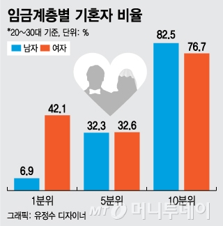 실제 남자의 경우 20~30대 기혼자의 비율은 소득 10분위중 1분위가 6.9%로 5분위 32.3%, 10분위 82.5%등 고소득층에 비해 현저하게 낮다.