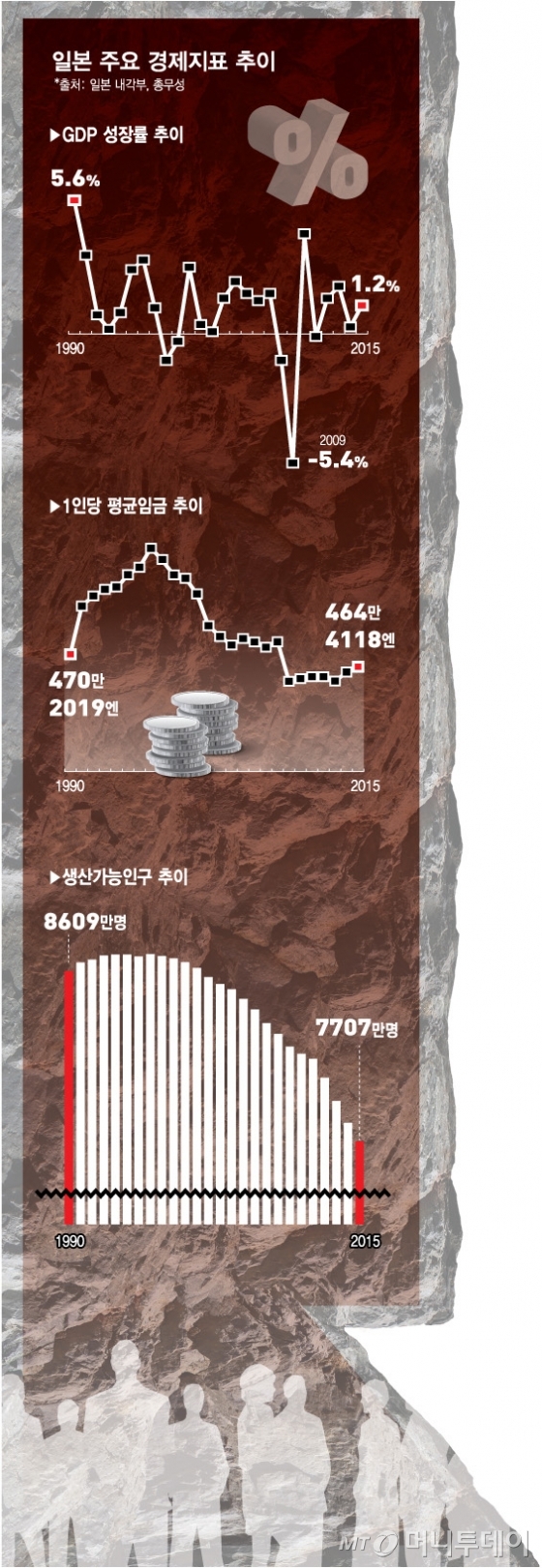 일본의 소비 정체는 실생활과 밀접한 통계를 보면 확연하다. 1990년대 부동산 버블 붕괴, 생산가능인구 감소. 고령화 등이 복합 작용해 나타난 경제 침체는 일본인의 삶 곳곳에 침투했다. 생산가능인구가 내리막길에 들어선 1996년을 전후로 일본은 먹는 것부터 줄였다.
