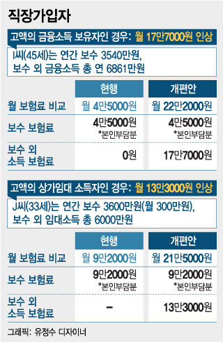 하지만 부과체계 개편(1단계) 후에는 보수 외 소득에 대해 월 17만7000원을 새로 내야 한다. 기존 보수 보험료까지 합쳐 보험료가 22만2000원으로 뛰는 것이다.