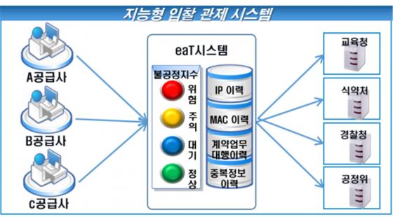 또한 eaT시스템의 「지능형 입찰비리 관제시스템」은 입찰담합 등 비리가 의심되는 정보를 모니터링 해 불공정지수를 4단계로 자동 산정하며, aT는 불공정지수 위험 단계에 이른 130여개 업체 정보를 교육부·식약처·경찰청 등과 공유하여, 순차적으로 업체 전수조사를 실시할 예정이다.