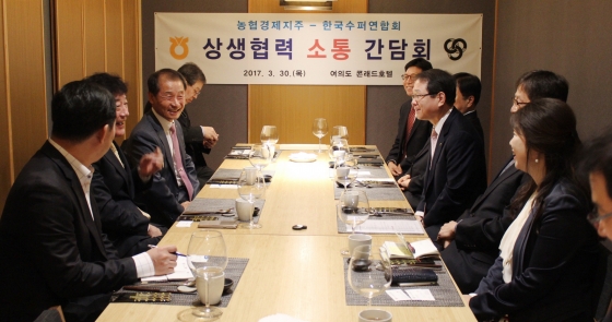 농협(회장 김병원)경제지주 김원석 농업경제대표이사와 한국수퍼마켓협동조합연합회 강갑봉 회장은 지난 30일 콘래드 서울(서울시 영등포구)에서 오찬을 함께 하며, 저성장 시대 소상공인 보호와 동반성장을 위한 상생협력방안을 논의했다.