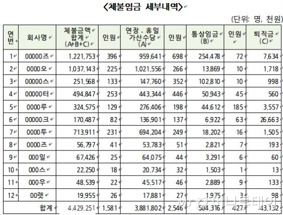 근로감독 결과 12개사 근로자 3250명 중 2057명(63.3%)이 주 12시간 연장근로 한도를 초과해 평균 6시간 더 일한 것으로 나타났다. 연장근로 수당, 퇴직금 과소산정 등 44억여원은 지급하지 않았다.