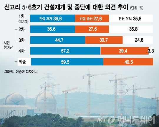 공론화위의 최종 조사 결과는 예상을 깨고 큰 격차로 건설 재개로 결론났다. 최종 4차 조사 결과 시민참여단 471명 중 59.5%가 신고리 5‧6호기 원자력발전소 건설 재개에 찬성했다. 이는 건설 중단 응답률 40.5%보다 19%포인트 높은 것이다.